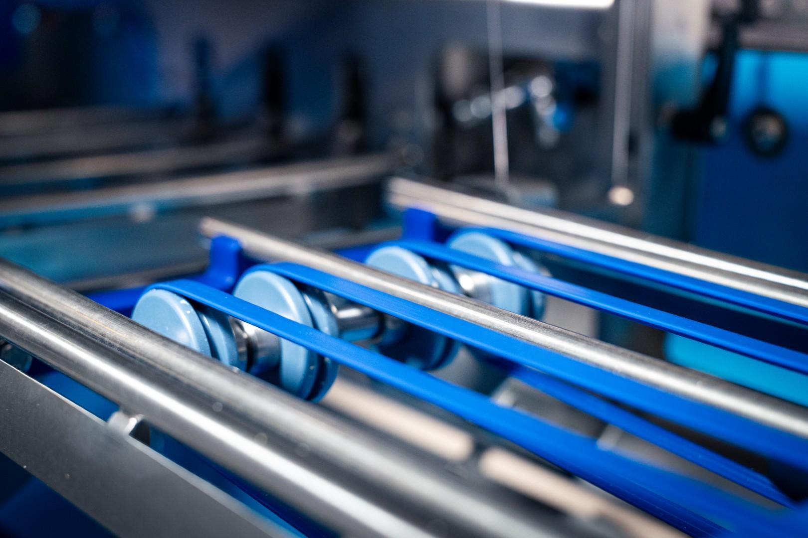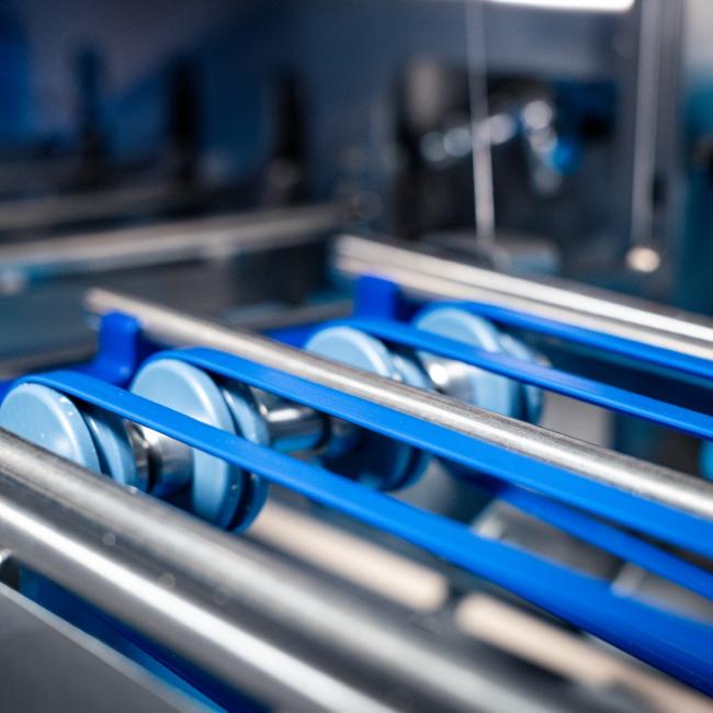Via een transportsysteem worden de plakken ingevoerd en in twee richtingen gesneden. Zo ontstaan haakse plakken met vaste maatvoering. Na het snijden worden de plakken aan de uitvoerzijde verpakt en zijn ze klaar voor levering.